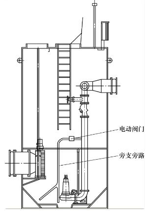 圖5 筒體底部CFD速度矢量圖 2.反沖洗裝置 保持一體化預制泵站外部結構不變,針對一體化預制泵站使用過程中出現的淤積問題,對一體化預制泵站的管路結構進行優化設計,如圖6所示。在一體化預制泵站內部的水泵出口的主管路上加設一道旁支管路結構,加設的旁支管路是一個或者多個較小口徑的管路,小口徑管路的出口對準一體化預制泵站井筒的內部容易產生淤積的位置。旁支管路和主管路之間設有電動閥門,閥門的電氣控制接入一體化預制泵站的控制柜系統,和水泵控制相關聯。 當一體化預制泵站中的水泵運行起動時,通過設定的控制程序打開旁支管路上的電動閥門,出水主管路內的部分壓力水從旁支管路流過,由于旁支管路管徑較小,使得流出的壓力水成為高速水流,高速水流對準一體化預制泵站井筒內部容易淤積的地方進行沖刷,使一體化預制泵站內沉積的雜質在水流重新沖擊下隨著水泵的運行而被輸送至一體化預制泵站外排出。根據一體化預制泵站具體運行工況,可以在控制系統中智能地調節電動閥門的啟閉以及開啟間隔。