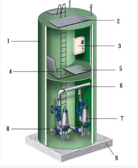 (1)一體化污水泵站的筒體采用玻璃鋼制作而成。 (2)組裝好的潛水排污泵(包括泵殼,葉輪,電機,機械密封件,泵軸等) (3)自動連接裝置和底座 (4)提升裝置(導軌系統(tǒng)和支架等) (5)壓力管道系統(tǒng)和閥門 (6)靜壓液位計和智能控制柜; (7)連接配件和所有用于安裝的緊固件;